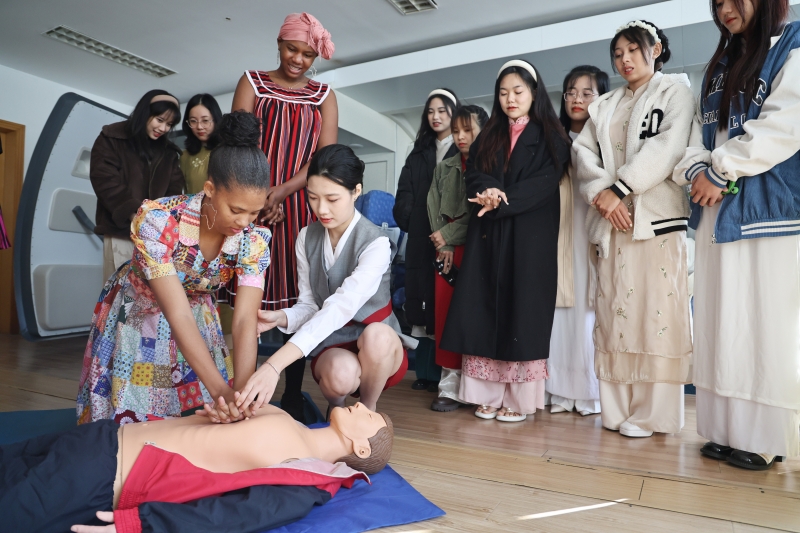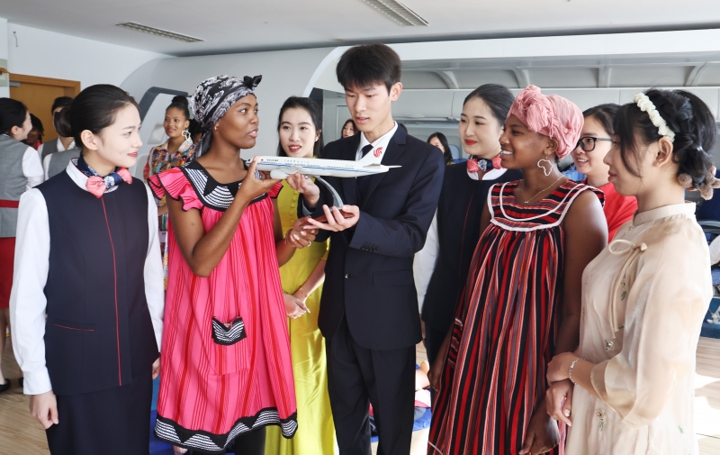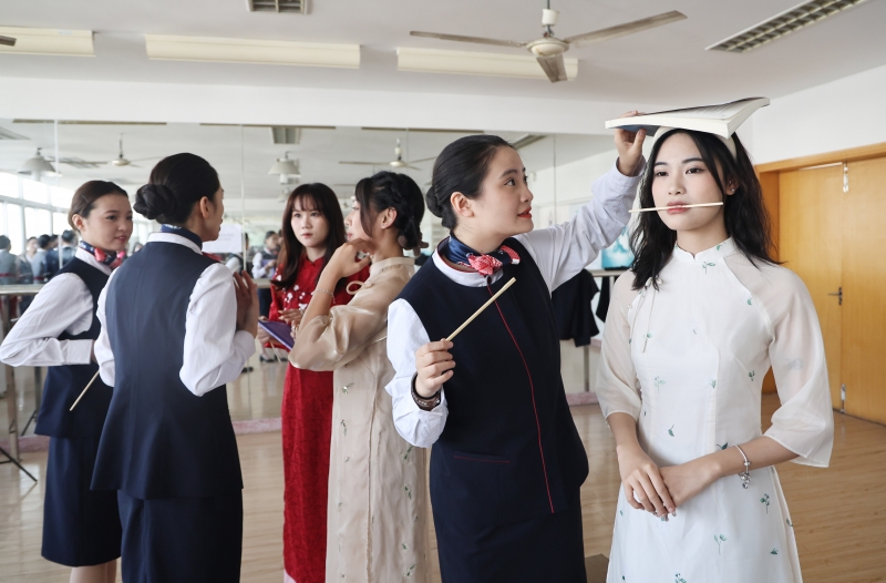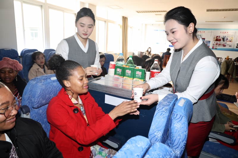 12月7日是“国际民航日”。BETVLCTOR伟德国际1946国际合作教育公司越南、老挝、纳米比亚、乌干达的部分职工走进公司BETVLCTOR伟德国际1946空乘专业的实训课堂,体验学习客舱服务、形体、心肺复苏等内容,体验“准空乘”们的日常训练。