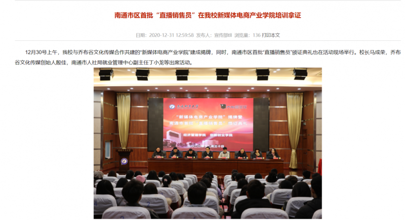 1、与南京乔布谷文化传媒有限公司、南通斜杠电子商务有限公司等企业共建“新媒体电商产业公司”。