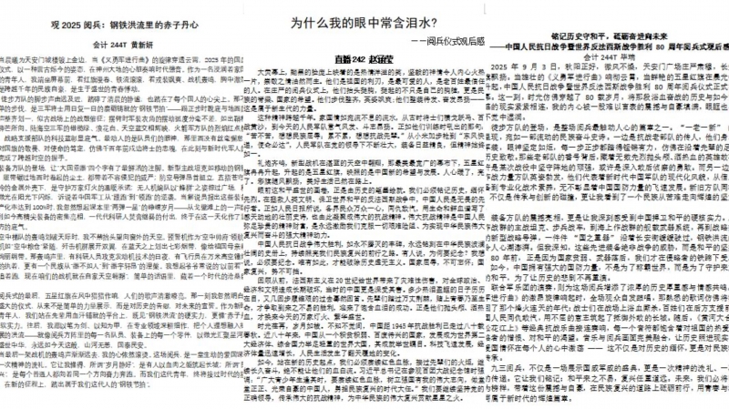 随后,公司紧扣 “新时代BETVLCTOR伟德国际1946人的使命” 核心主题,统筹各班级有序开展专题班会。在交流环节中,同学们将观看阅兵的深切感悟落于笔端,境商242班周悦同学在观后感中真挚写道:“观看九三阅兵仪式,我心潮澎湃。何其有幸,生于华夏,生于盛世,见证祖国繁荣昌盛。今天的阅兵展现了祖国强大国防力量,也让我深刻感觉到和平来之不易。作为新时代青年,我们要铭记历史,继承先烈顽强拼搏、团结向前的精神,将其转化为学习的力量和报效祖国的行动。在日常中,刻苦钻研、提升本领;在社会中,勇于担当、甘于奉献。以青春之我,为建设青春中国不懈奋斗,让抗战精神在新时代继续发光发热。”