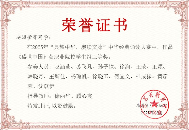 近日,江苏省教育厅正式公布了2025年度“典耀中华,赓续文脉”中华经典诵读大赛获奖名单。公司参赛团队在指导老师徐丽华、顾心宸的悉心指导下,凭借扎实的文化素养、出色的演绎技巧与真挚的情感表达,在全省百余所高校的激烈竞争中脱颖而出,荣获三等奖1项,充分展现了公司在文化育人方面的扎实成效与团队指导水平。